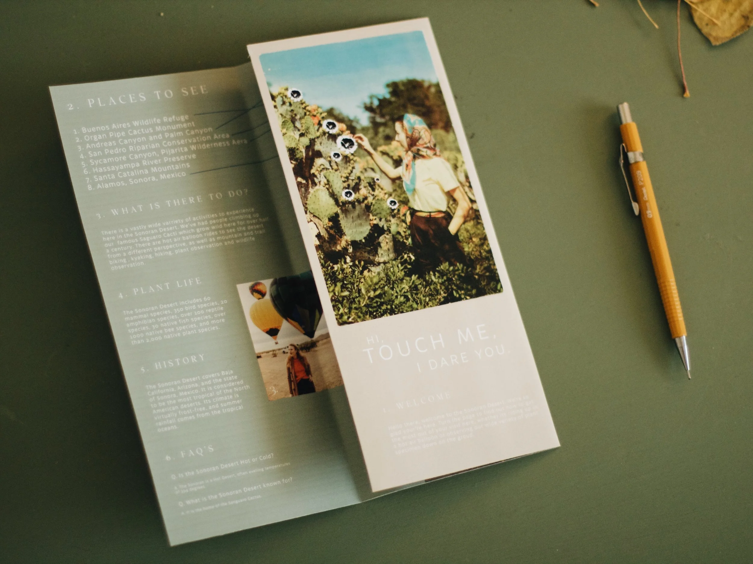 Design wise, deserts have always embodied this oddly clean and arid feeling for me, almost giving off a minimalist elegance. This was the feeling I wanted to pursue and communicate with using a very open, san serif typeface and simplistic, airy layout with clean lines. Secondly, I wanted the colors to come from the landscape itself, and the activities the park offers. It was important that the colors were genuine and warm, while also a little bit exhilarating.